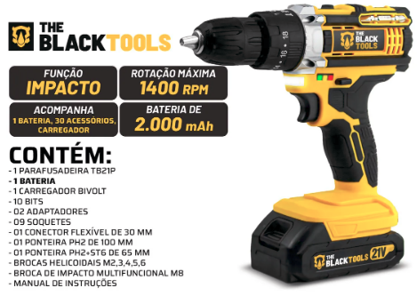 A Parafusadeira e Furadeira Impacto The Black Tools TB PW é bivolt, funcionando em 110V e 220V.